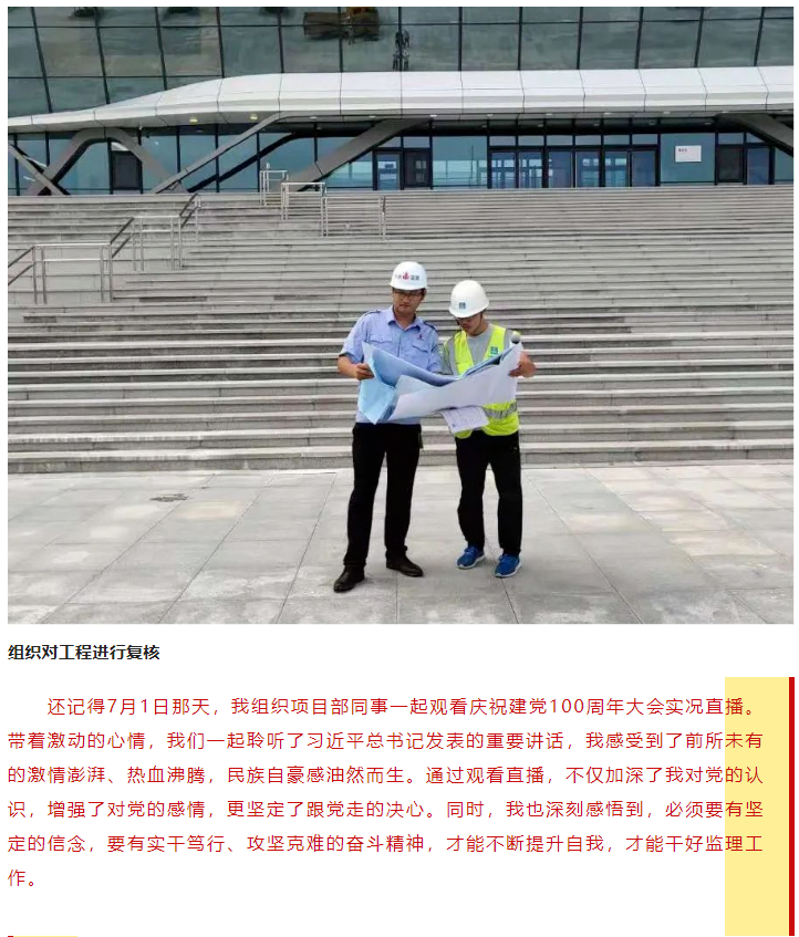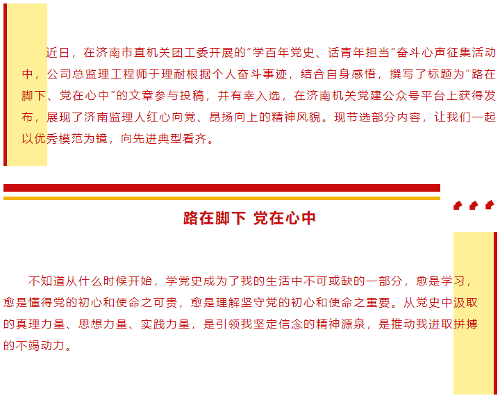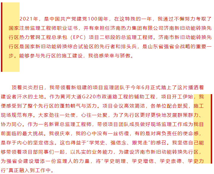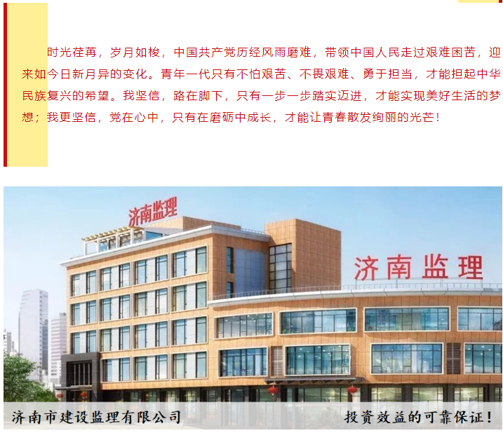 濟(jì)南監(jiān)理總監(jiān)理工程師于理耐奮斗事跡獲市直機(jī)關(guān)團(tuán)工委“學(xué)百年黨史 話青年擔(dān)當(dāng)”奮斗心聲活動展播