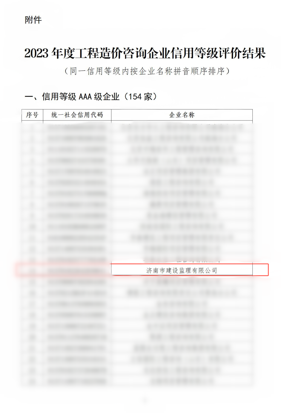 7月24日,山東省住房和城鄉(xiāng)建設(shè)廳公布了“2023年度山東省工程造價咨詢企業(yè)信用等級評價結(jié)果”,全省共有828家企業(yè)參加本次評審,我公司在此次造價咨詢企業(yè)信用等級評價中獲得最高“AAA等級”評價。
