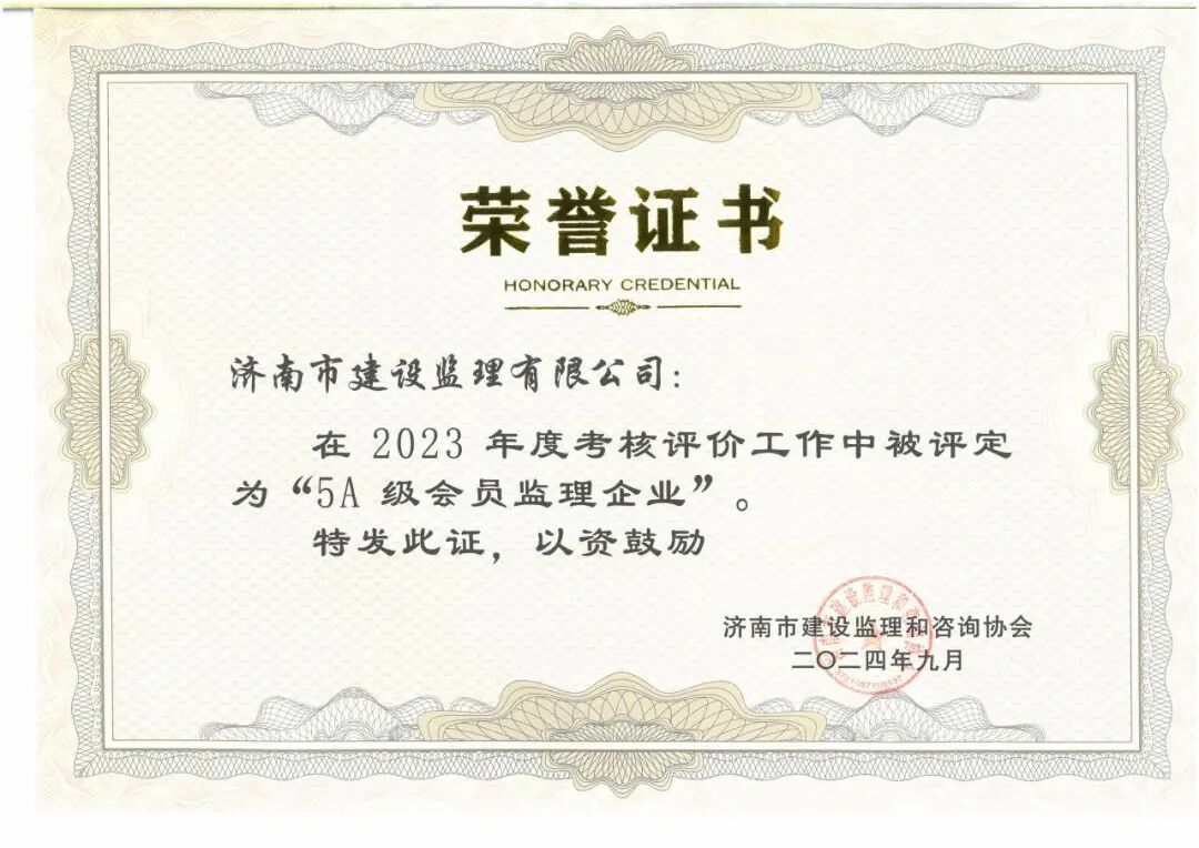 濟(jì)南市建設(shè)監(jiān)理和咨詢協(xié)會(huì)公布了2023年度監(jiān)理企業(yè)和從業(yè)人員考核評(píng)價(jià)結(jié)果,濟(jì)南監(jiān)理榮獲“2023年度5A級(jí)會(huì)員監(jiān)理企業(yè)”,陳志翔等17名同志分別榮獲“5A級(jí)總監(jiān)理工程師”、“5A級(jí)專業(yè)監(jiān)理工程師”和“5A級(jí)監(jiān)理員”。