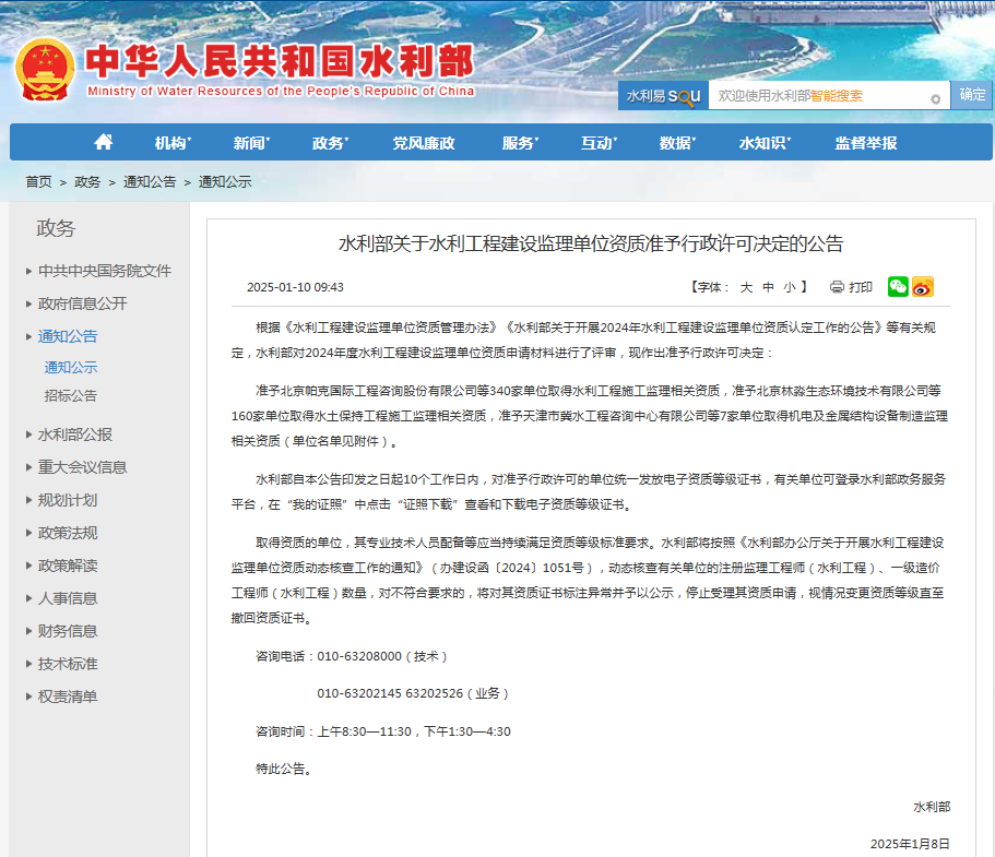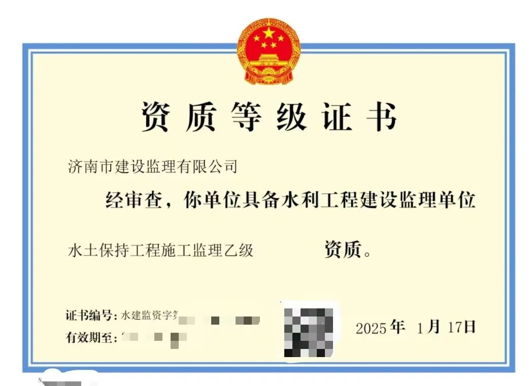 二〇二五年一月,經水利部批準,我公司同時取得水利工程施工監(jiān)理乙級資質及水土保持工程施工監(jiān)理乙級資質。這是我公司在取得工程監(jiān)理綜合資質后,又獲得的住建部管理范疇之外的從業(yè)資格,為公司經營業(yè)務開辟新的領域,為公司業(yè)務類型的拓展提供新的平臺,也為公司持續(xù)、快速發(fā)展奠定了堅實基礎。