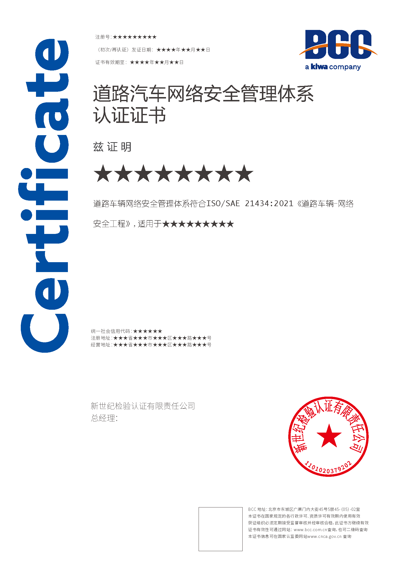 本頁涉及的認證服務中均有對應的《認證實施規(guī)則》,BCC擁有其最終解釋權。任何組織及個人未經(jīng)BCC許可,不得以任何形式全部或部分使用(法律要求除外)認證相關信息。如需獲取相關實施規(guī)則請用以下方式聯(lián)系獲?。弘娫挘?10-58579316 郵箱:fwjs@kiwa.cn