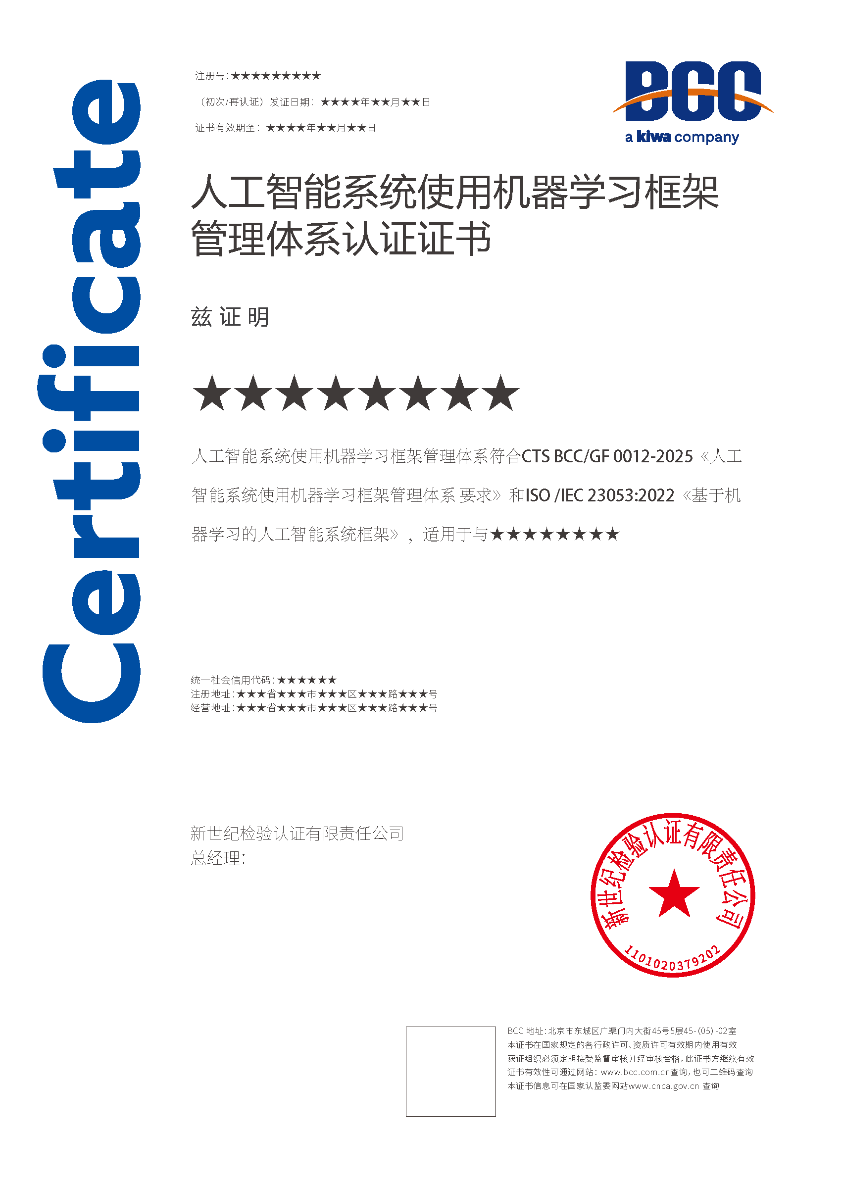 本頁涉及的認證服務中均有對應的《認證實施規(guī)則》,BCC擁有其最終解釋權。任何組織及個人未經BCC許可,不得以任何形式全部或部分使用(法律要求除外)認證相關信息。如需獲取相關實施規(guī)則請用以下方式聯系獲?。弘娫挘?10-58579316 郵箱:fwjs@kiwa.cn