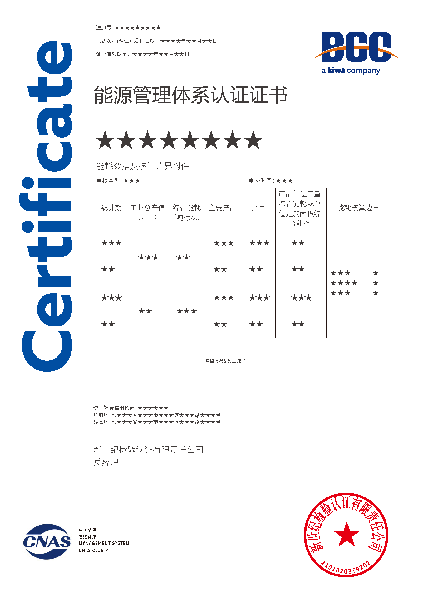 能源管理體系認證證書 能源管理體系認證證書(能耗附件)