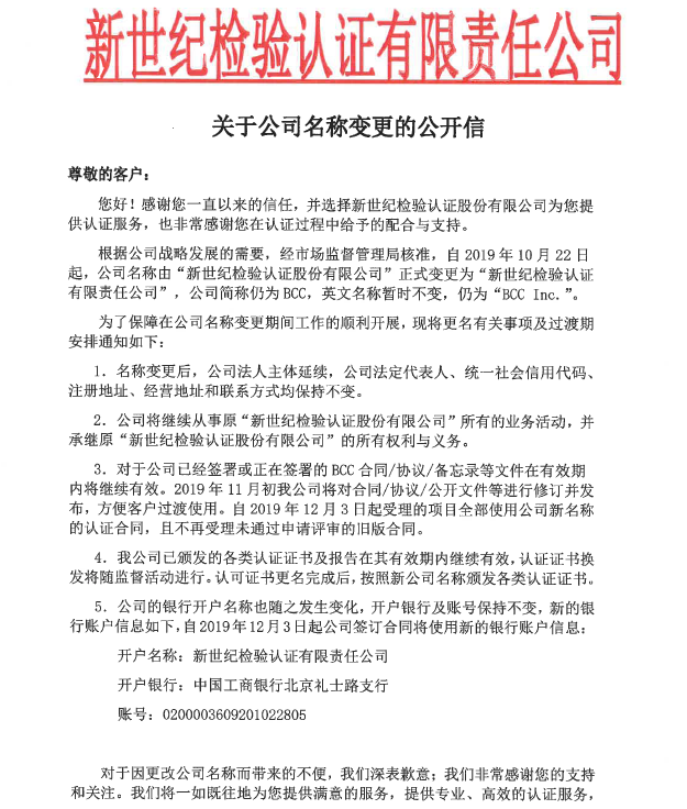 根據(jù)公司戰(zhàn)略發(fā)展的需要,經(jīng)市場(chǎng)監(jiān)督管理局核準(zhǔn),自2019年10月22日起,公司名稱由“新世紀(jì)檢驗(yàn)認(rèn)證股份有限公司”正式變更為“新世紀(jì)檢驗(yàn)認(rèn)證有限責(zé)任公司”,公司簡(jiǎn)稱仍為BCC,英文名稱暫時(shí)不變,仍為“BCC Inc.”。