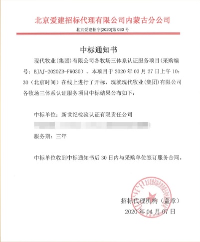 近日,新世紀(jì)檢驗(yàn)認(rèn)證有限責(zé)任公司(簡(jiǎn)稱 BCC)收到來(lái)自現(xiàn)代牧業(yè)(集團(tuán))有限公司的中標(biāo)通知,成為該公司總部及14家牧場(chǎng)質(zhì)量、環(huán)境、職業(yè)健康安全管理體系認(rèn)證項(xiàng)目的服務(wù)提供商。