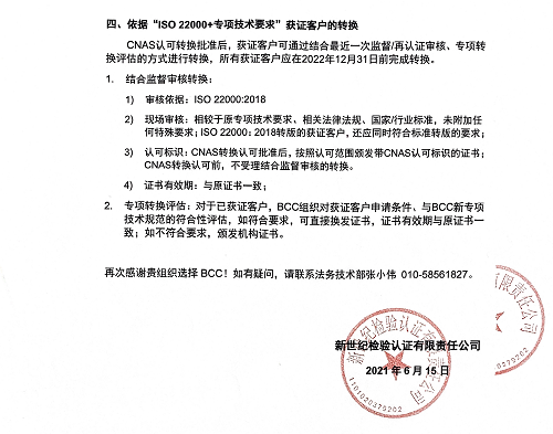 • 2021年7月1日(含)后通過認(rèn)證決定的,依據(jù)本告知書第四條款通過專項(xiàng)轉(zhuǎn)換評估后,經(jīng)評估符合要求的,頒發(fā)依據(jù)“ISO22000:2018”的認(rèn)證證書;經(jīng)評估不符合要求的,頒發(fā)BCC機(jī)構(gòu)證書;